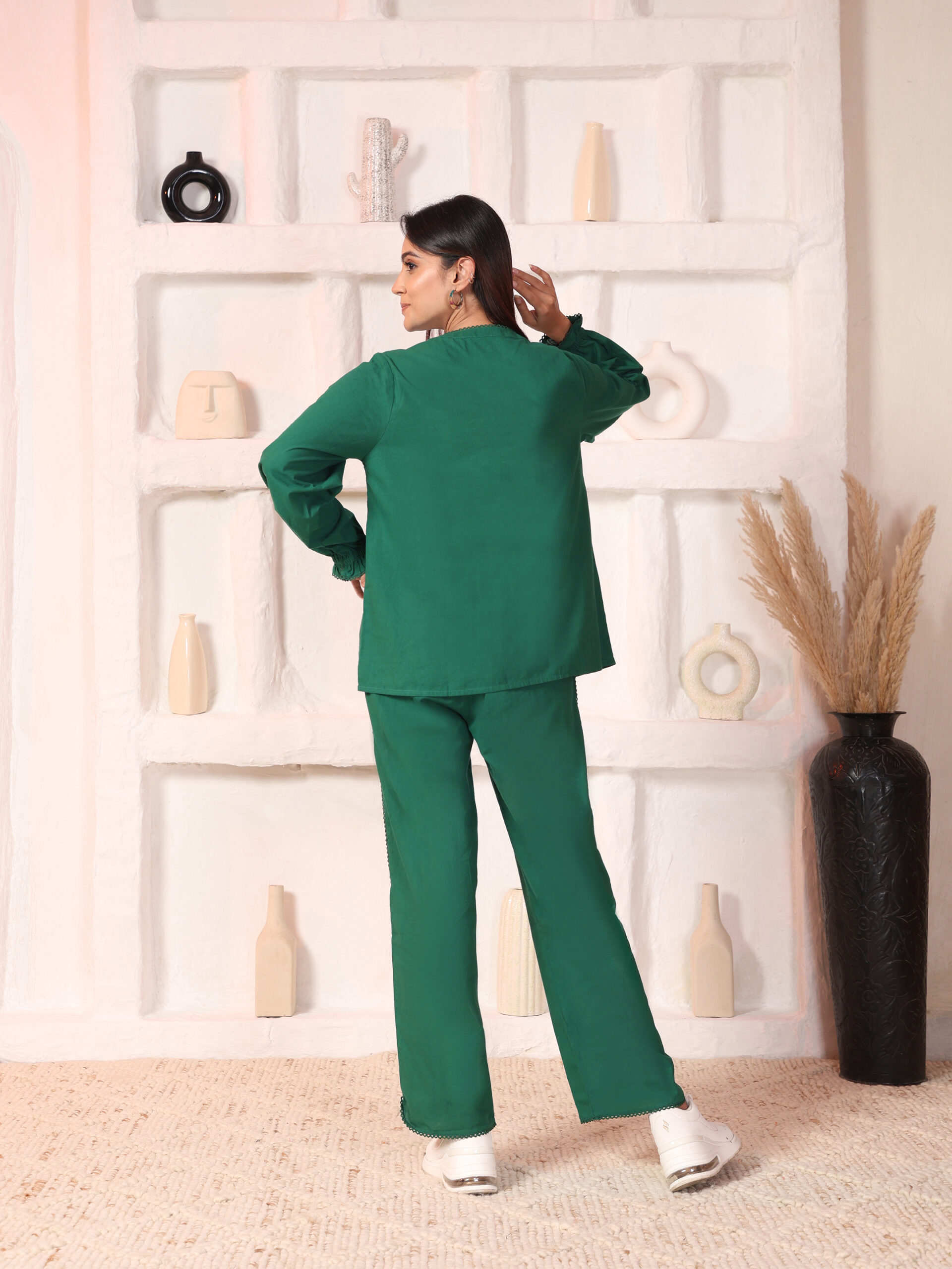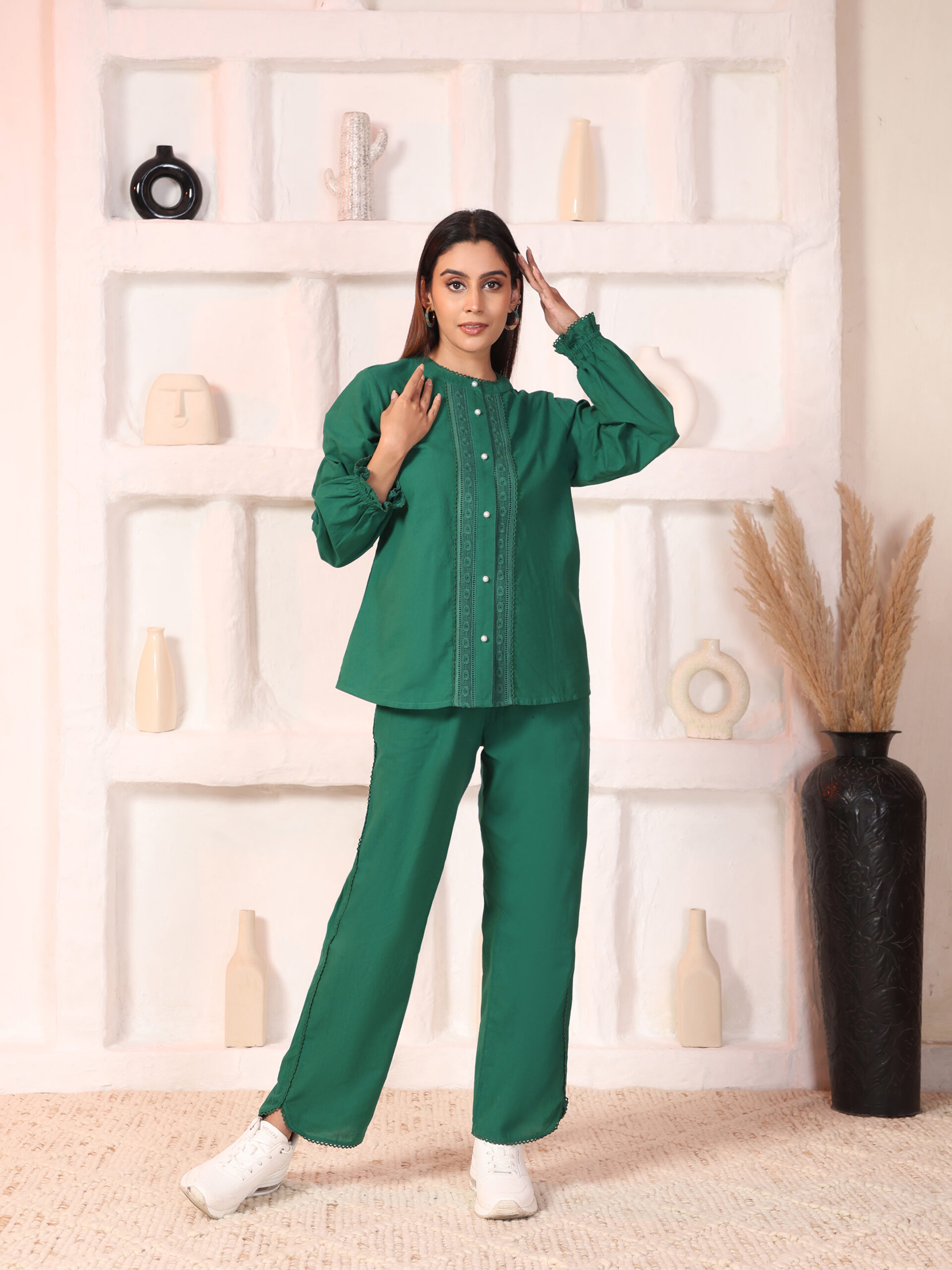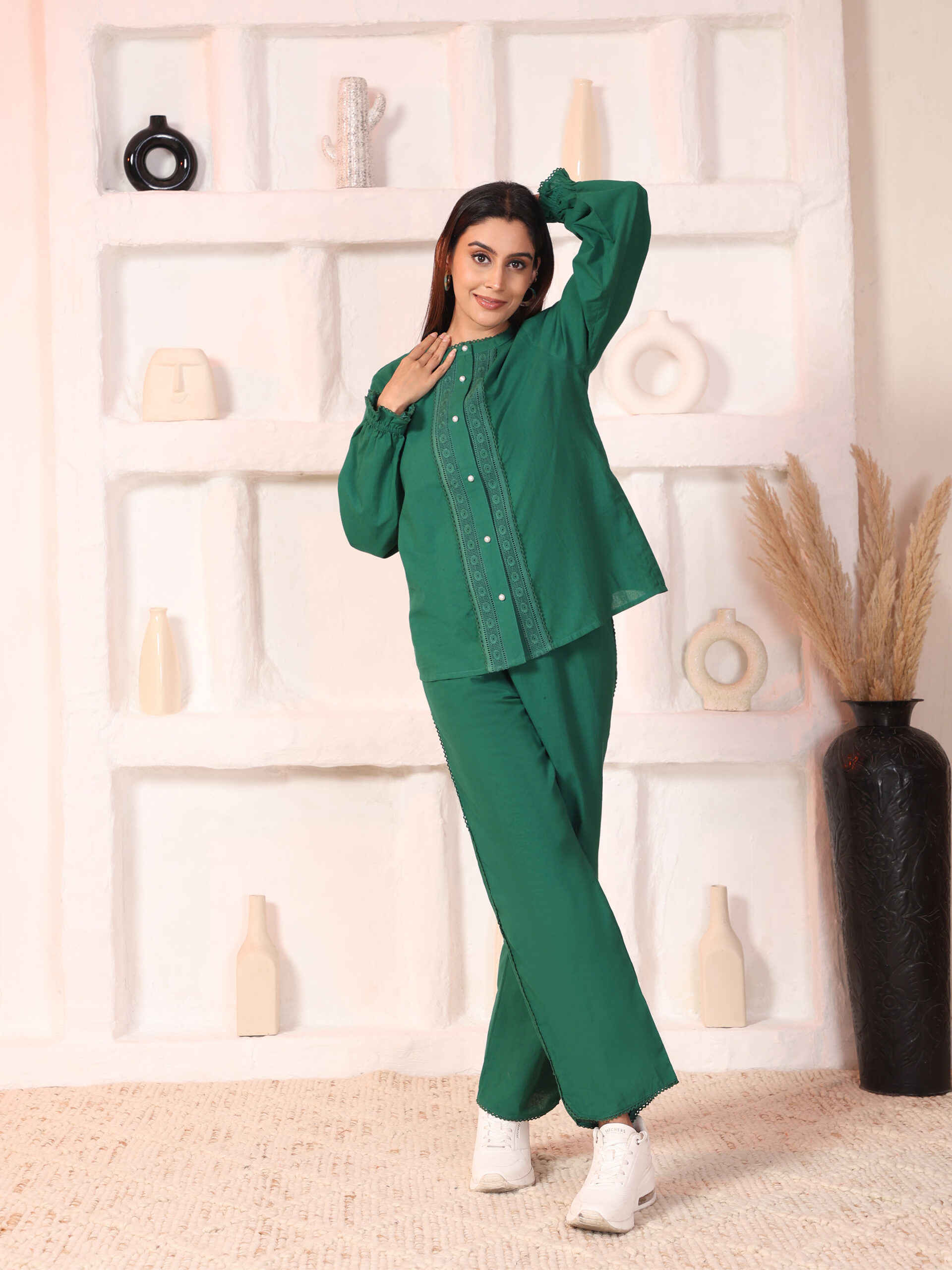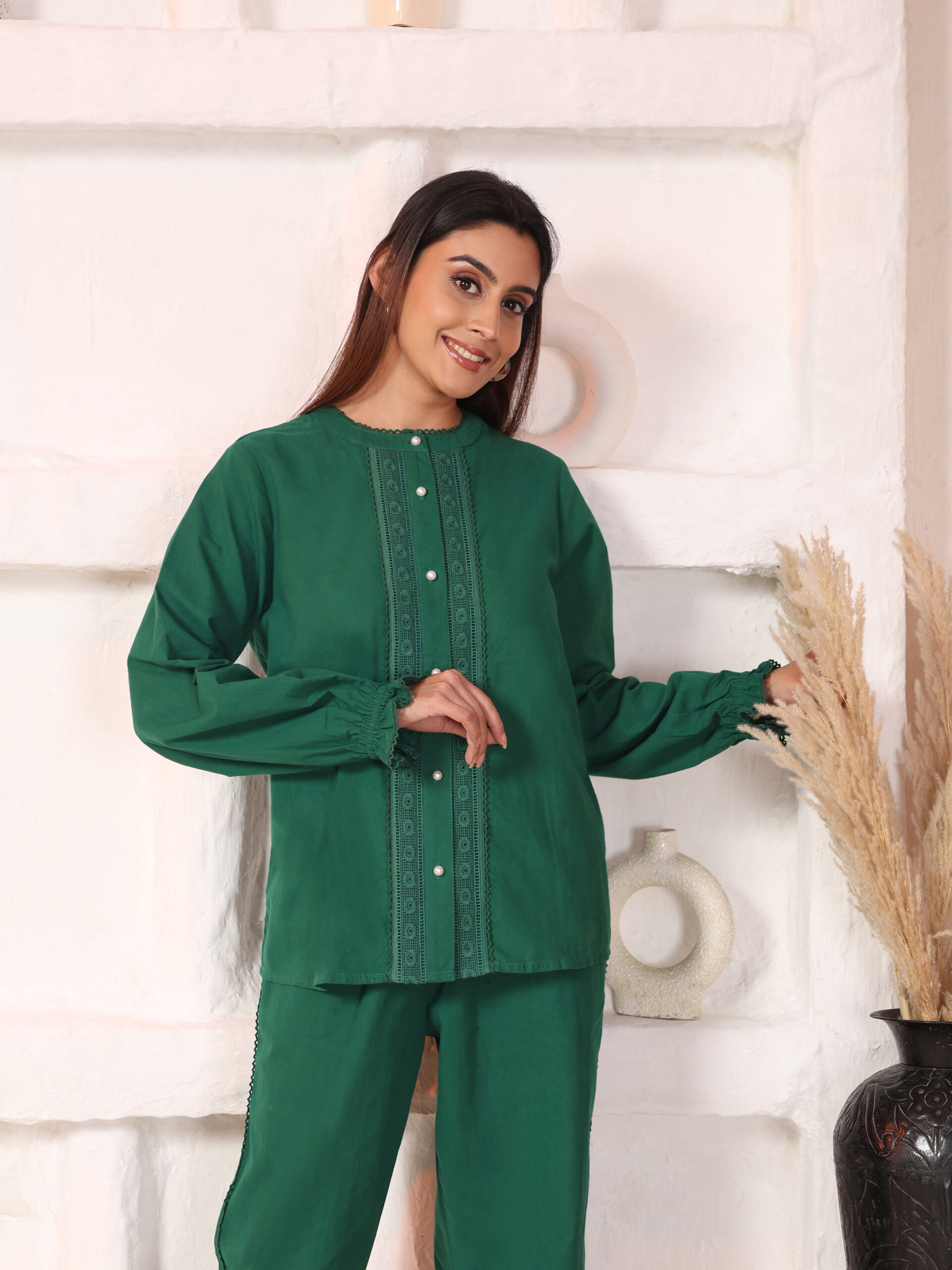 Effortlessly elegant with thoughtful details, the Beryl embroidered co-ord set is designed for days that call for comfort with structure. The shirt features a classic mandarin collar with full sleeves, highlighted by delicate embroidery that adds handcrafted charm.