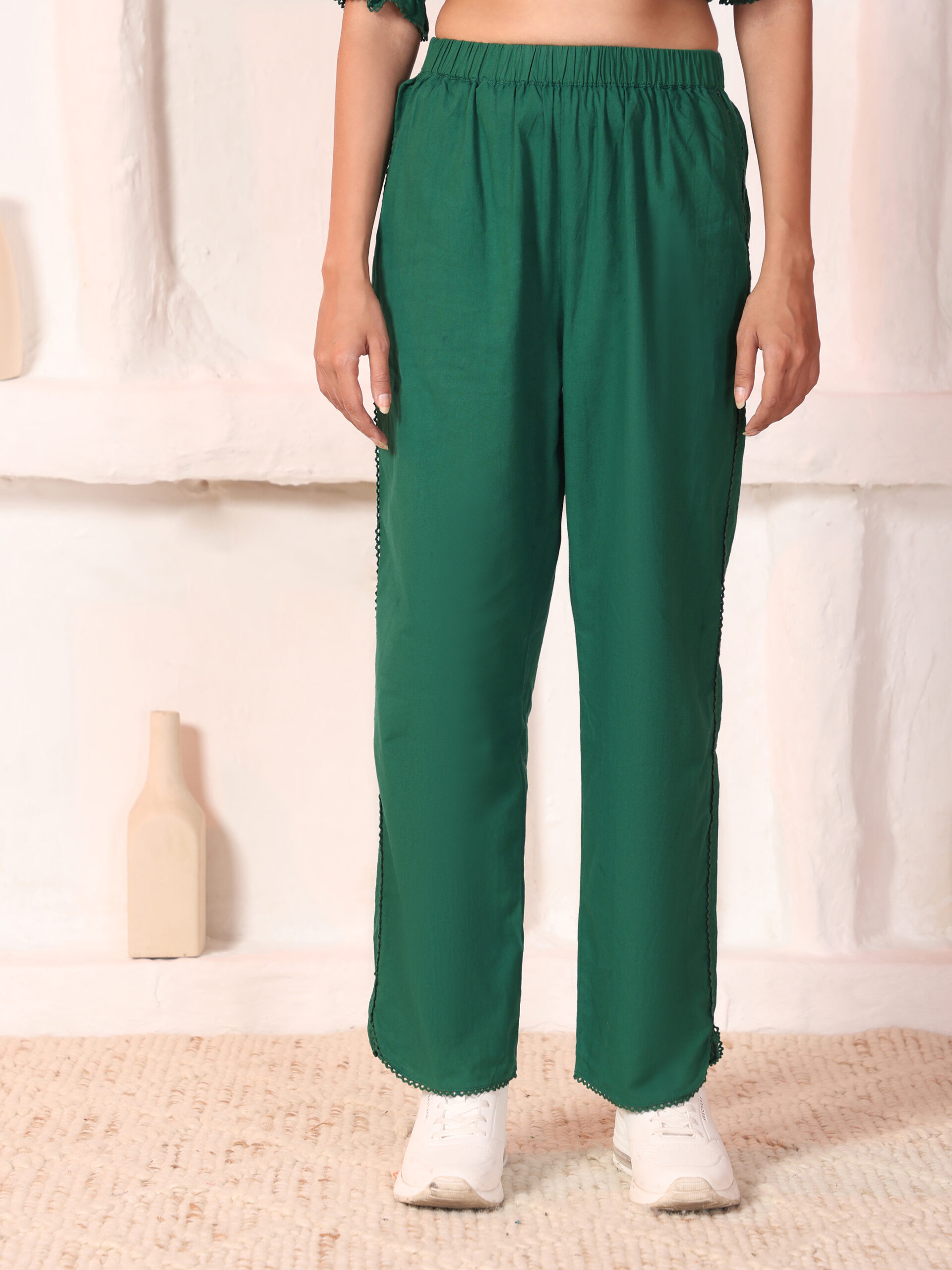 The matching pants come with an all-round elasticated waist and functional side pockets, offering ease of movement while maintaining a tailored look. Crafted from breathable 30’s cotton sheeting, this set transitions seamlessly from casual daytime wear to relaxed evening styling.