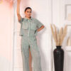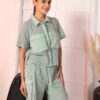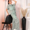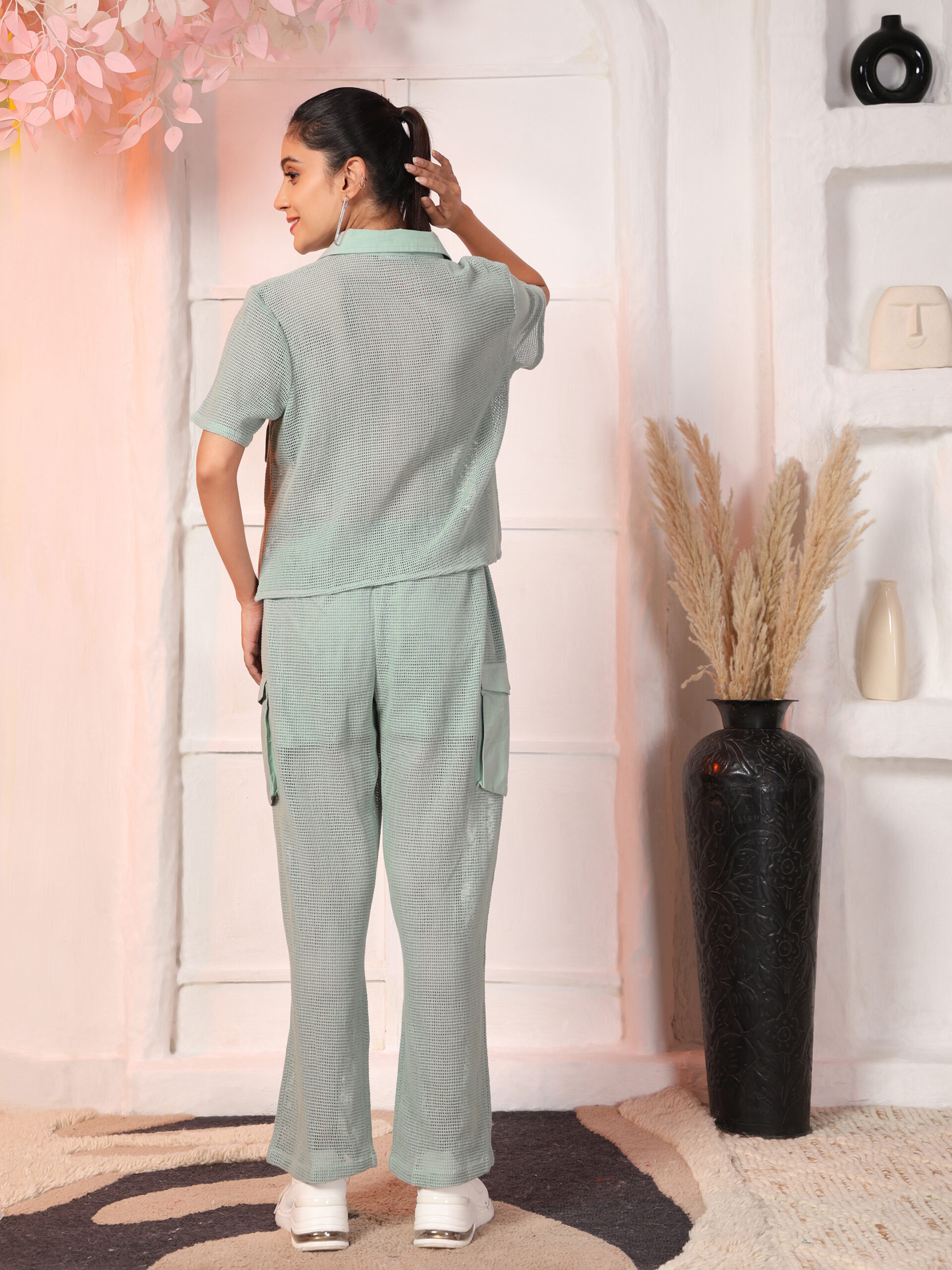 A versatile blend of comfort and utility, this co-ord set is designed for days that call for effortless movement with a structured edge. The shirt features a clean shirt collar and half sleeves, offering a breathable silhouette ideal for warmer climates. The pants are tailored with an all-round elasticated waist and functional cargo pockets on both sides — secured with flaps and shell buttons for a refined take on utilitarian style.