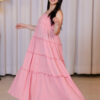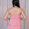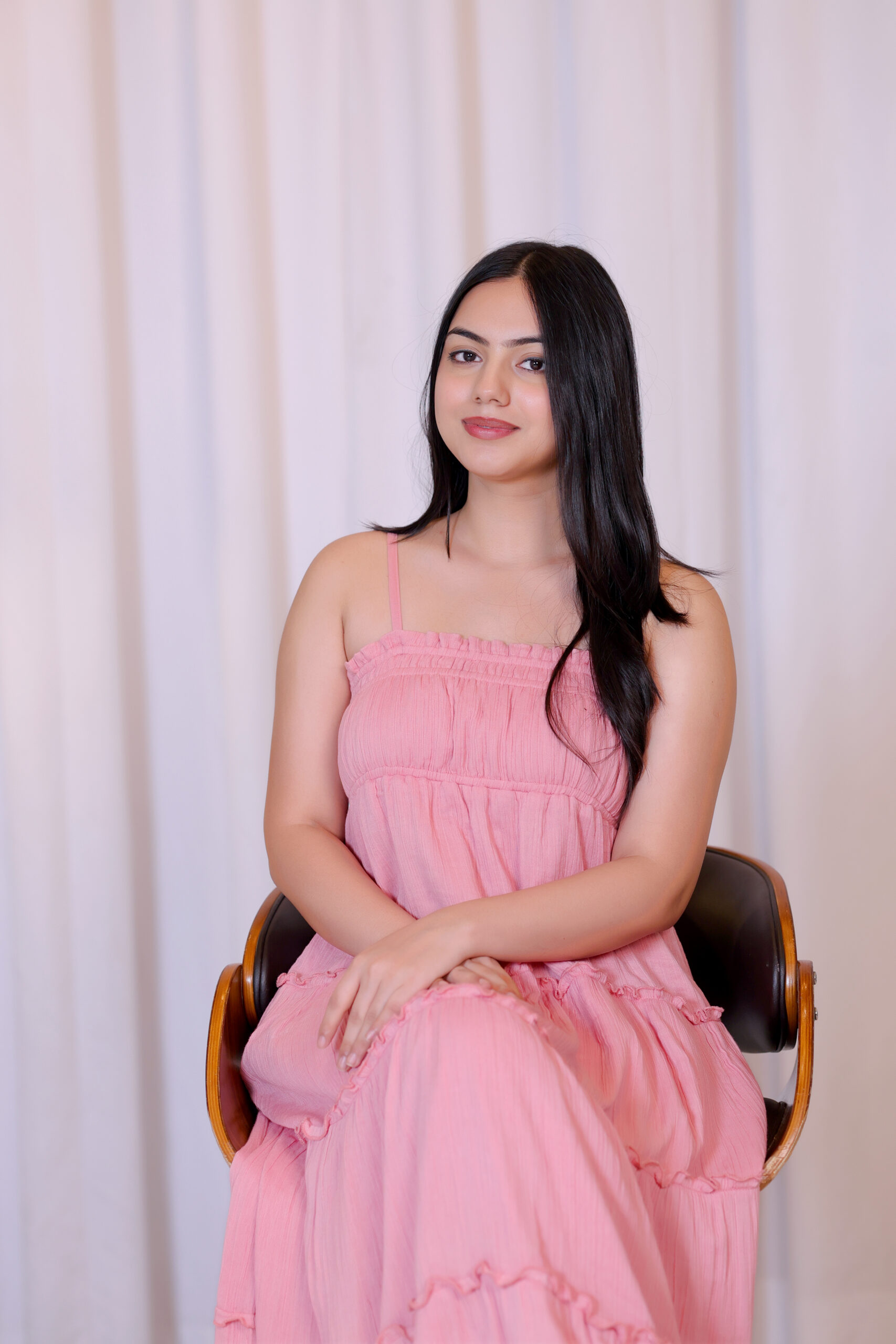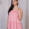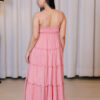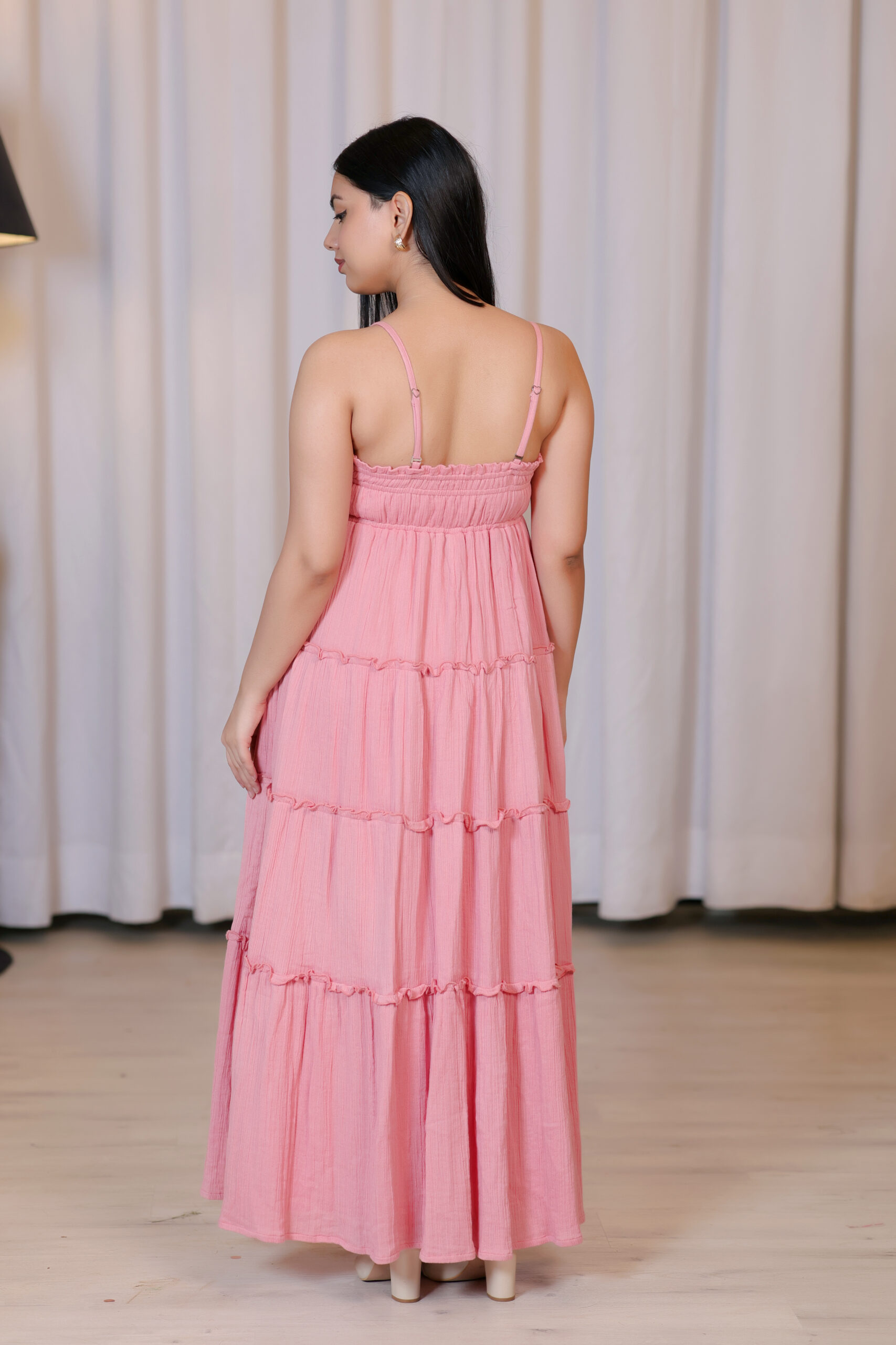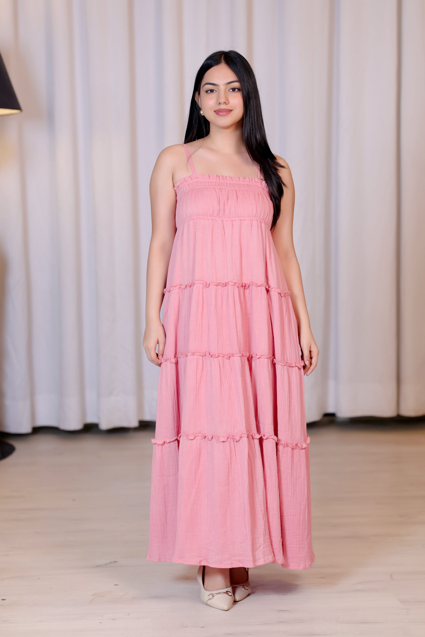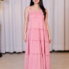 Softly romantic with a playful flow, this ankle-length dress is designed to move with grace. Featuring a square neckline and shoulder straps with ring and adjuster, the fit is both flattering and flexible. The tiered flared hem is finished with delicate baby overlock edging — a subtle detail that adds texture and charm to the silhouette.